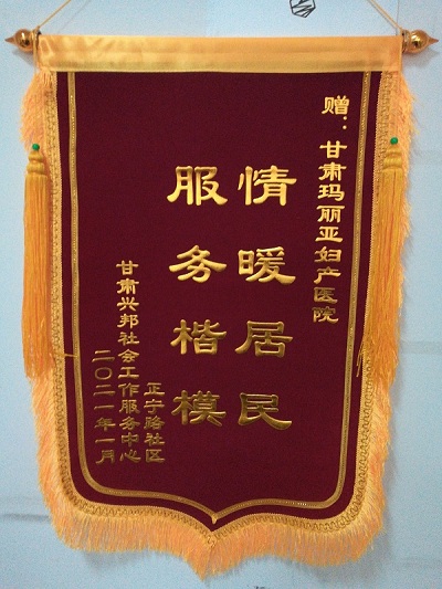 2021年1月8日,由正宁路社区、甘肃兴邦社会工作服务中心举办的“志愿精神促进会”上,甘肃玛丽亚妇产医院医疗志愿服务活动荣获表彰:锦旗一面“情暖居民 服务楷模”;荣誉证书一本“优秀志愿者团队”。这是对玛丽亚医院2020年度医疗志愿服务活动的认可和肯定,极大鼓舞了志愿服务团队的工作信心。