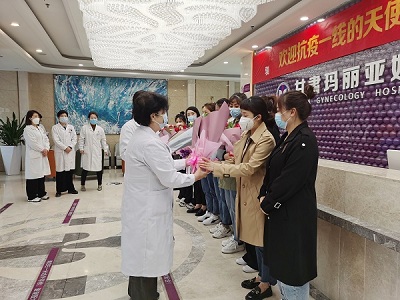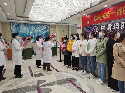 上午8时30分,一个简短而温馨的欢迎仪式在医院一楼大厅举行。行政院长杨春秀、业务院长宋兆平带领院院办、护理、院感、人事、医务、经营等部门负责人在医院门诊大厅欢迎抗疫天使们凯旋归来。院领导向王文媛等十名抗疫天使送上了鲜花,向她们表示了慰问!